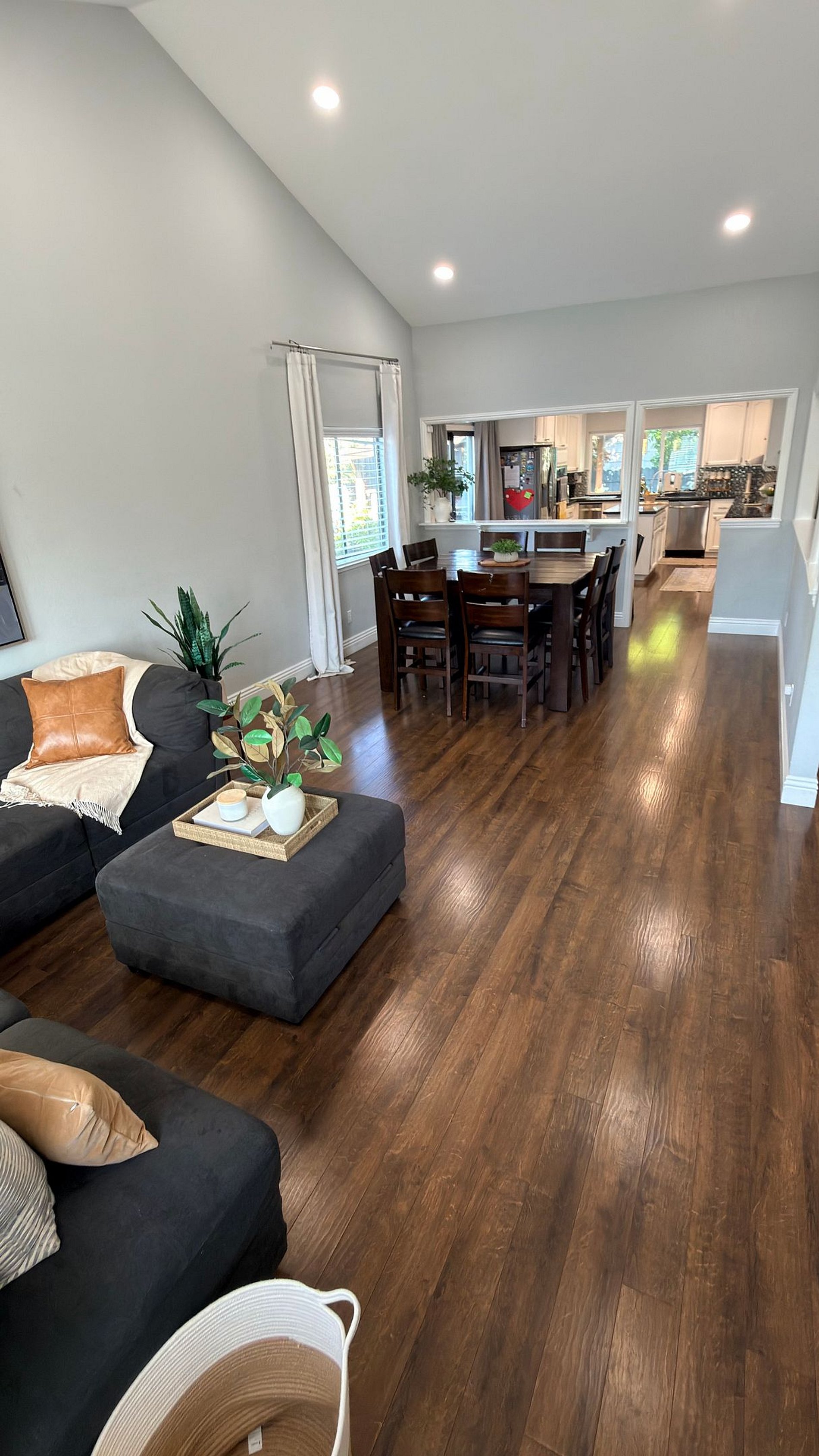 The heart of the home is the open-concept living area, where a plush, oversized sofa beckons you to unwind. The highlight is the massive 85-inch Smart TV, paired with a cozy electric fireplace. Whether you’re watching a movie with the family or the big game with friends, it’s a true cinema-at-home experience. The adjoining dining area seats eight, making it perfect for holiday meals or board game nights.