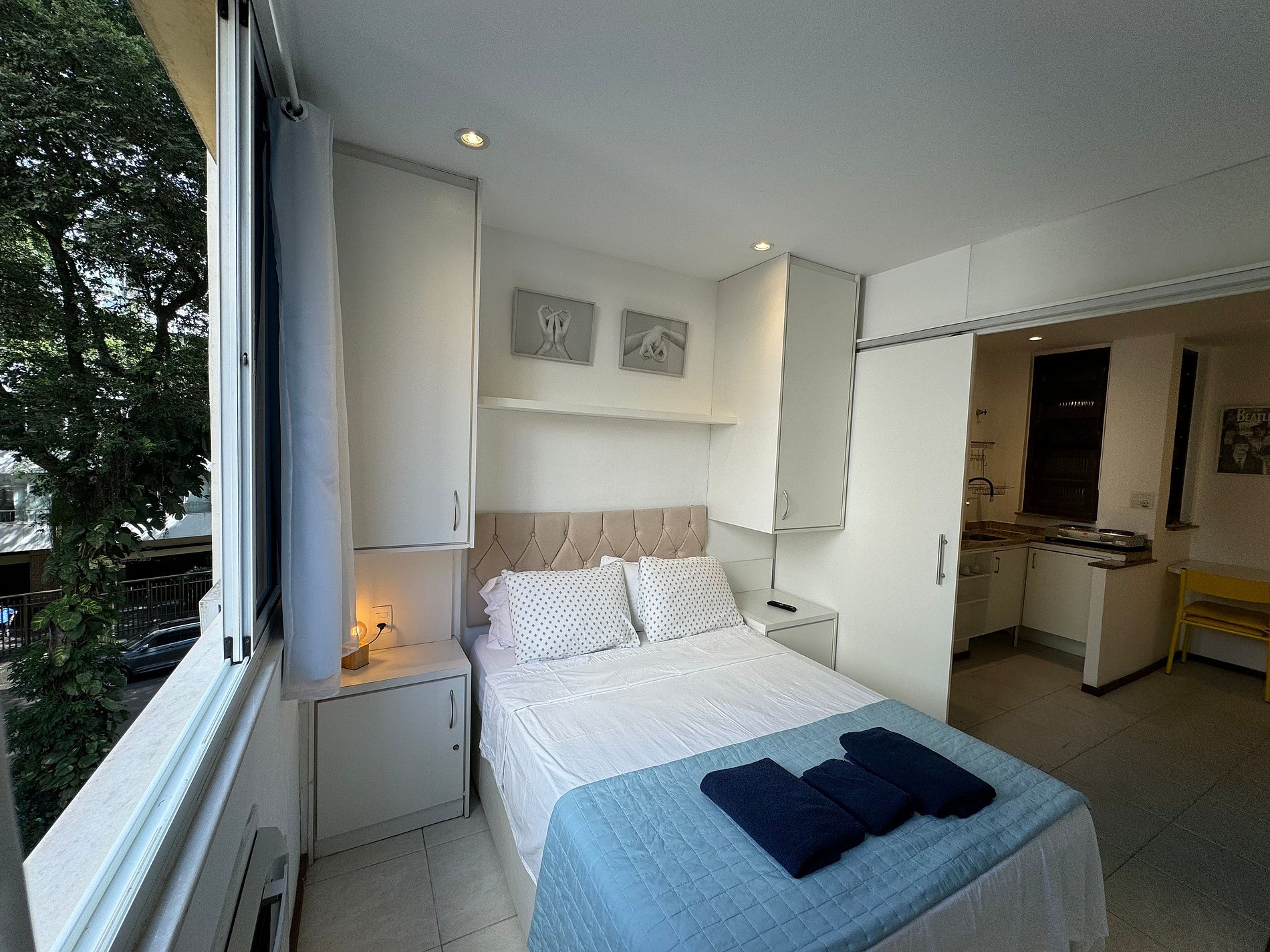 O nosso Studio é exclusivo e único, com uma decoração clean e minimalista pensada exatamente para trazer o máximo de conforto e praticidade aos nossos hóspedes. No quarto temos uma cama de casal de tamanho padrão com colchão muito confortável e armários planejados para que você possa acomodar todos os seus pertences. Para seu momento de relaxar poderá curtir um filme ou seu programa favorito em nossa TV. Nossa cozinha compacta está equipada com utensílios básicos para sua estada, com fogão elétrico de duas bocas, microondas, cafeteira e geladeira duplex, onde nossos hóspedes poderão preparar e armazenar suas refeições e lanches durante o seu tempo por aqui.