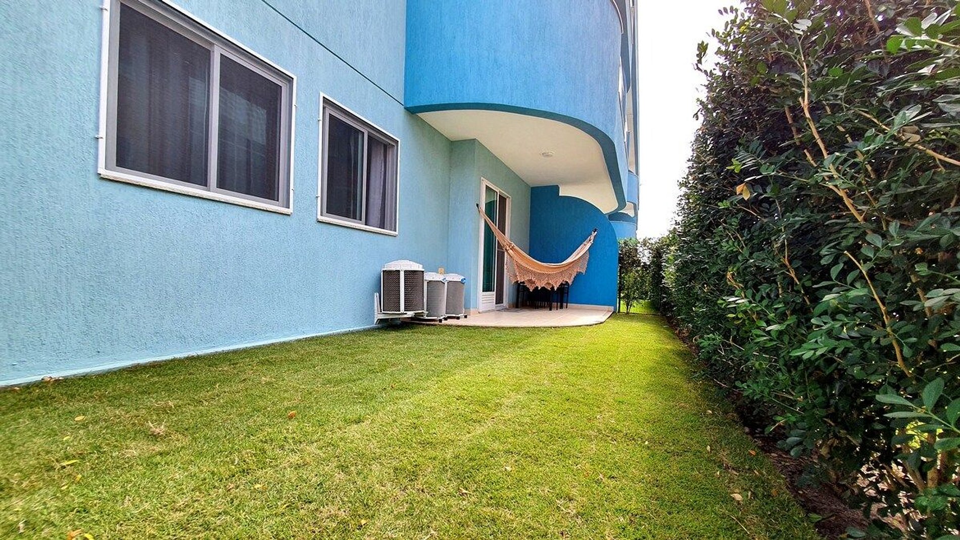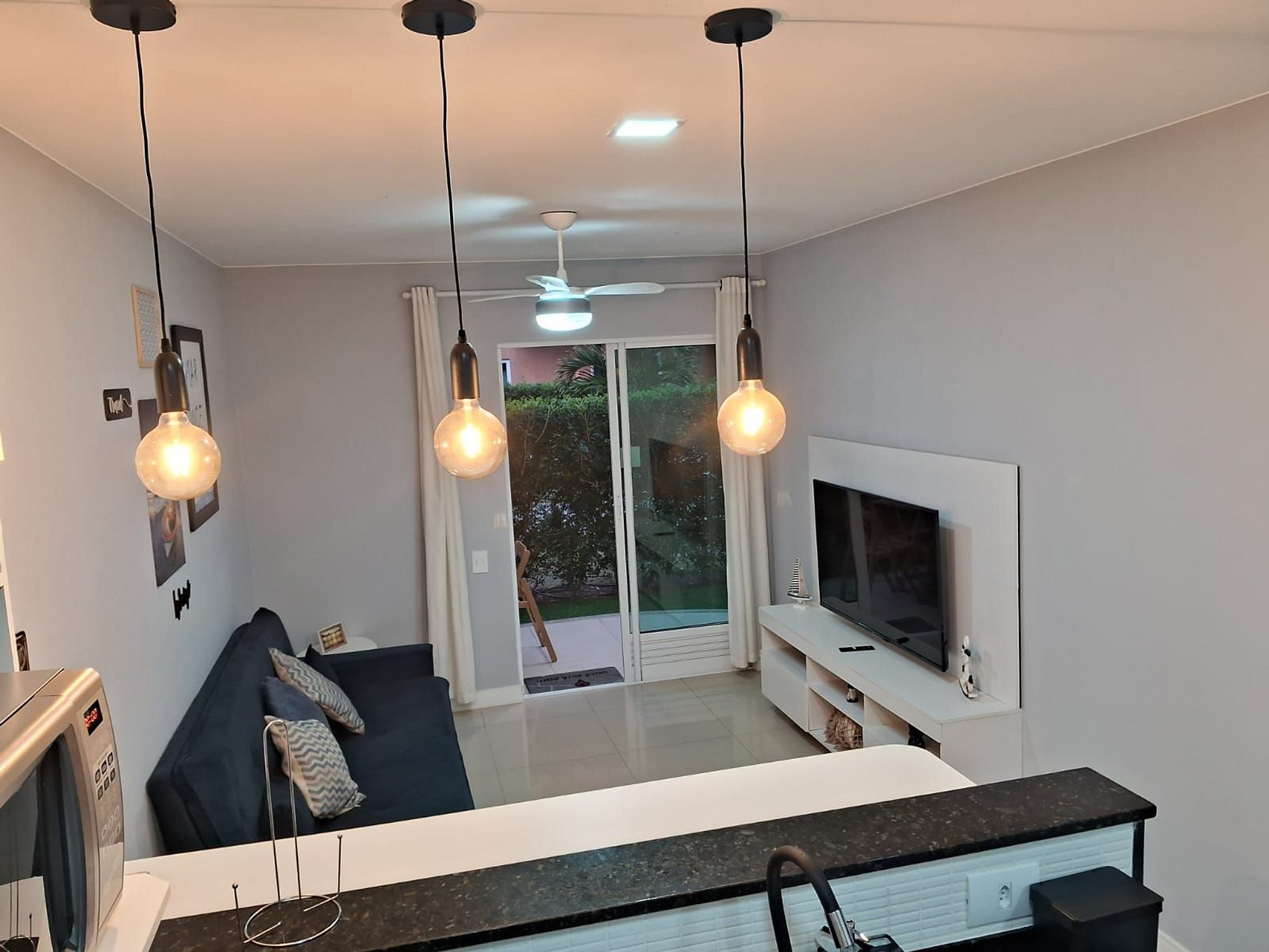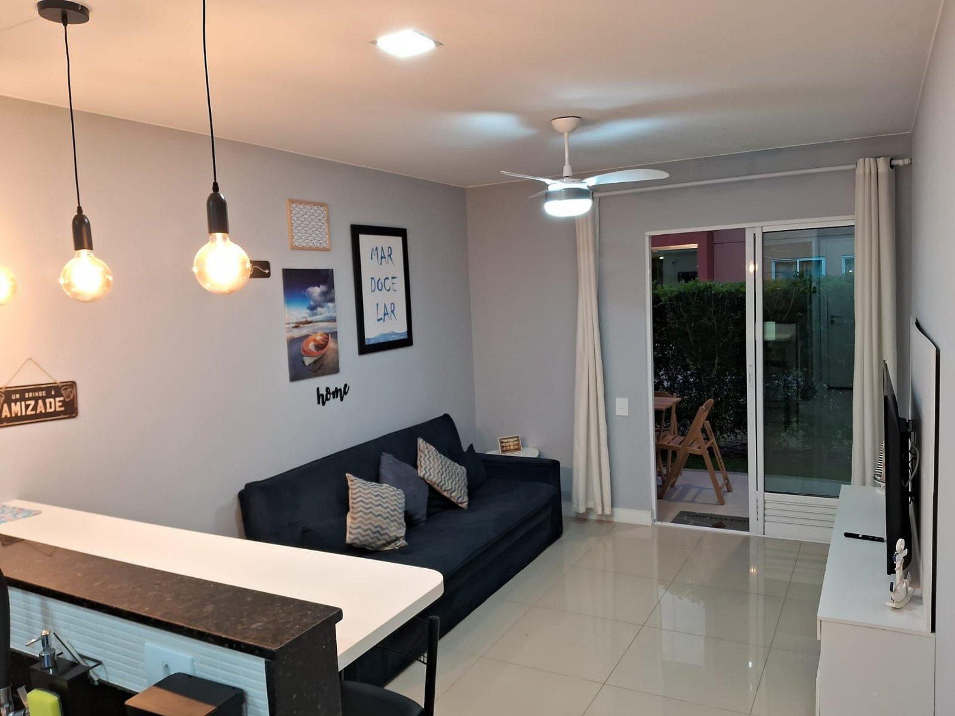 Apartamento completo mobiliado no térreo para até 6 pessoas com varanda e área externa exclusiva, 2 quartos com ar condicionado, 2 banheiros (1 suíte), sala e cozinha em conceito aberto, roupas de cama e banho inclusas.