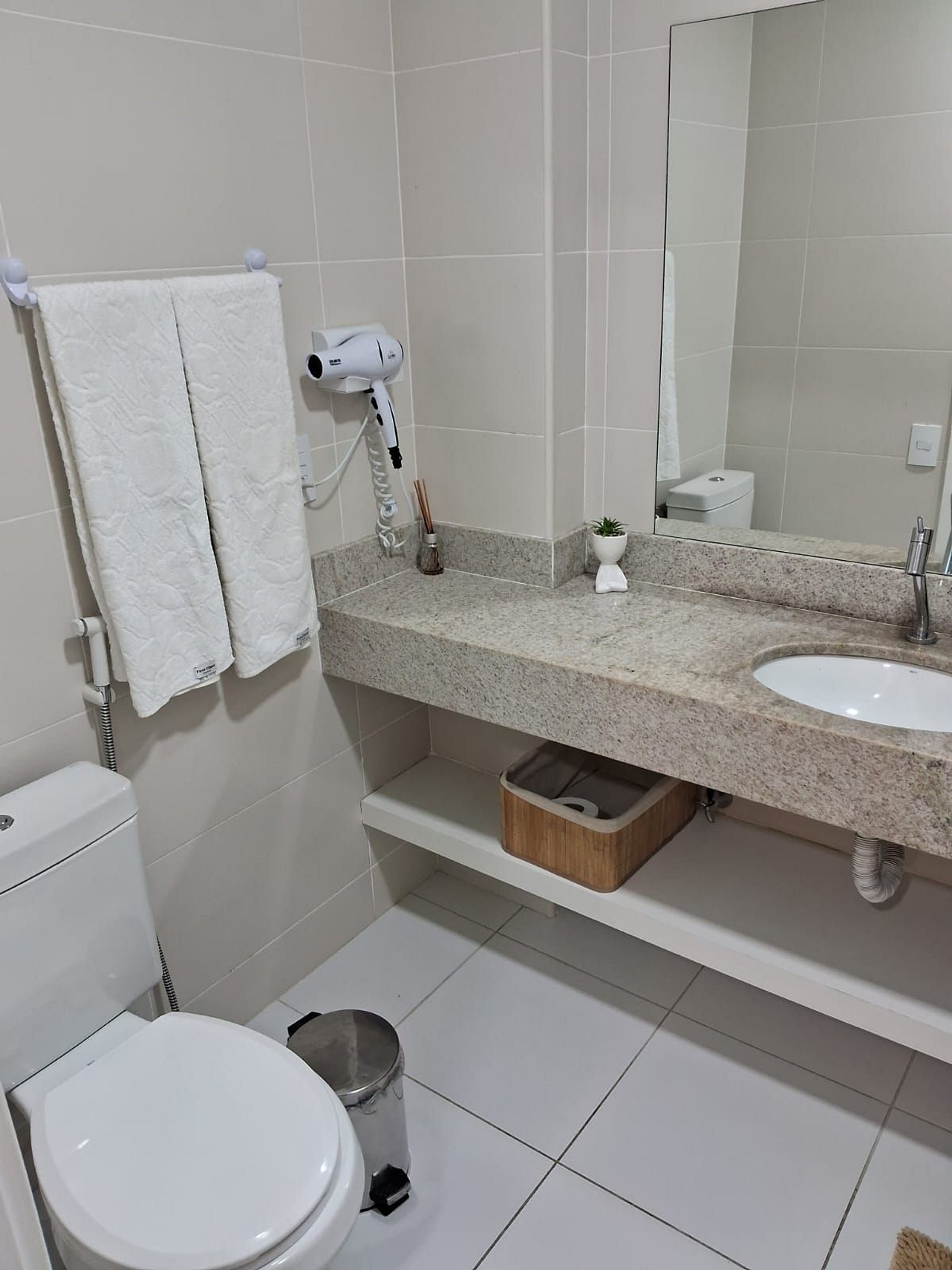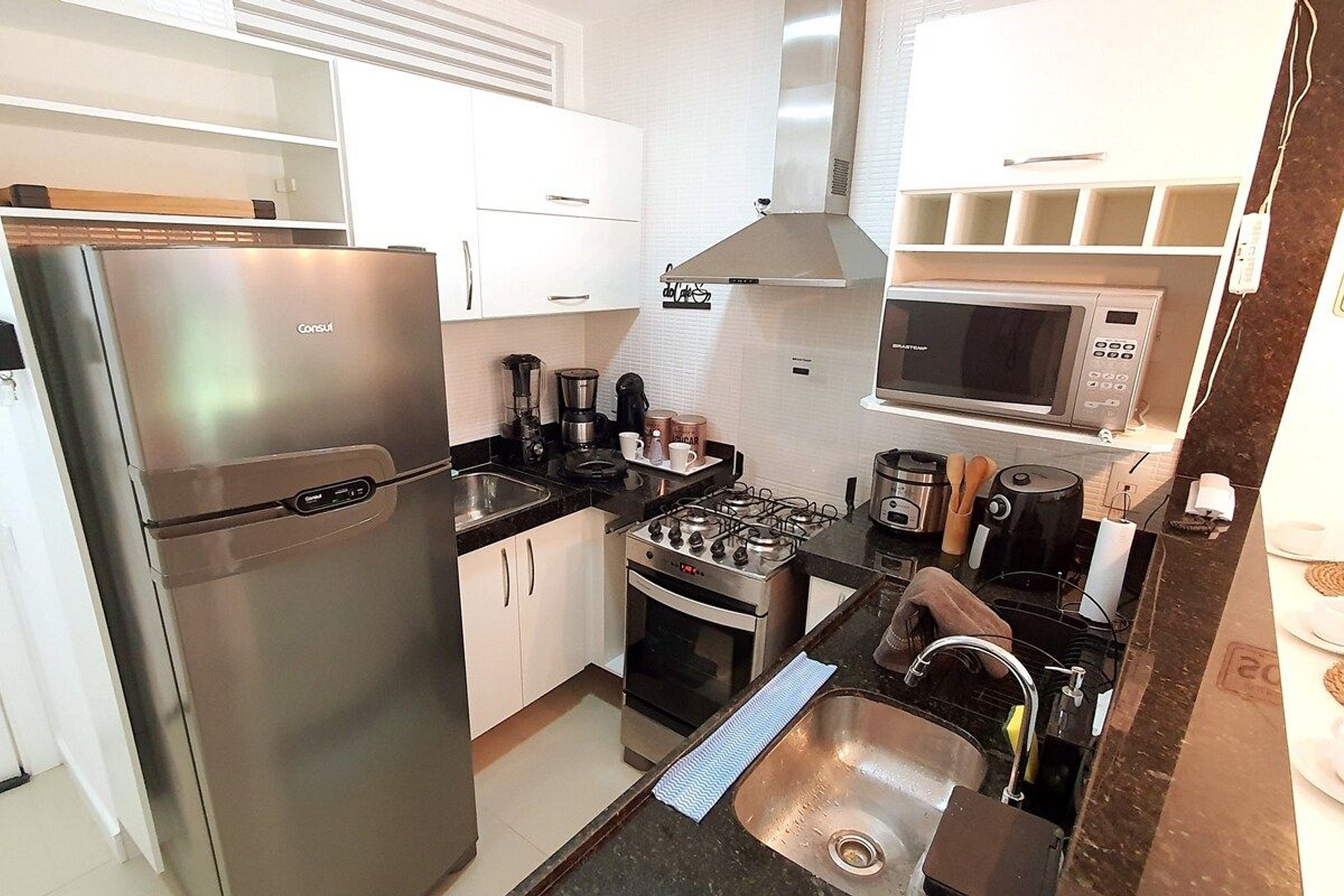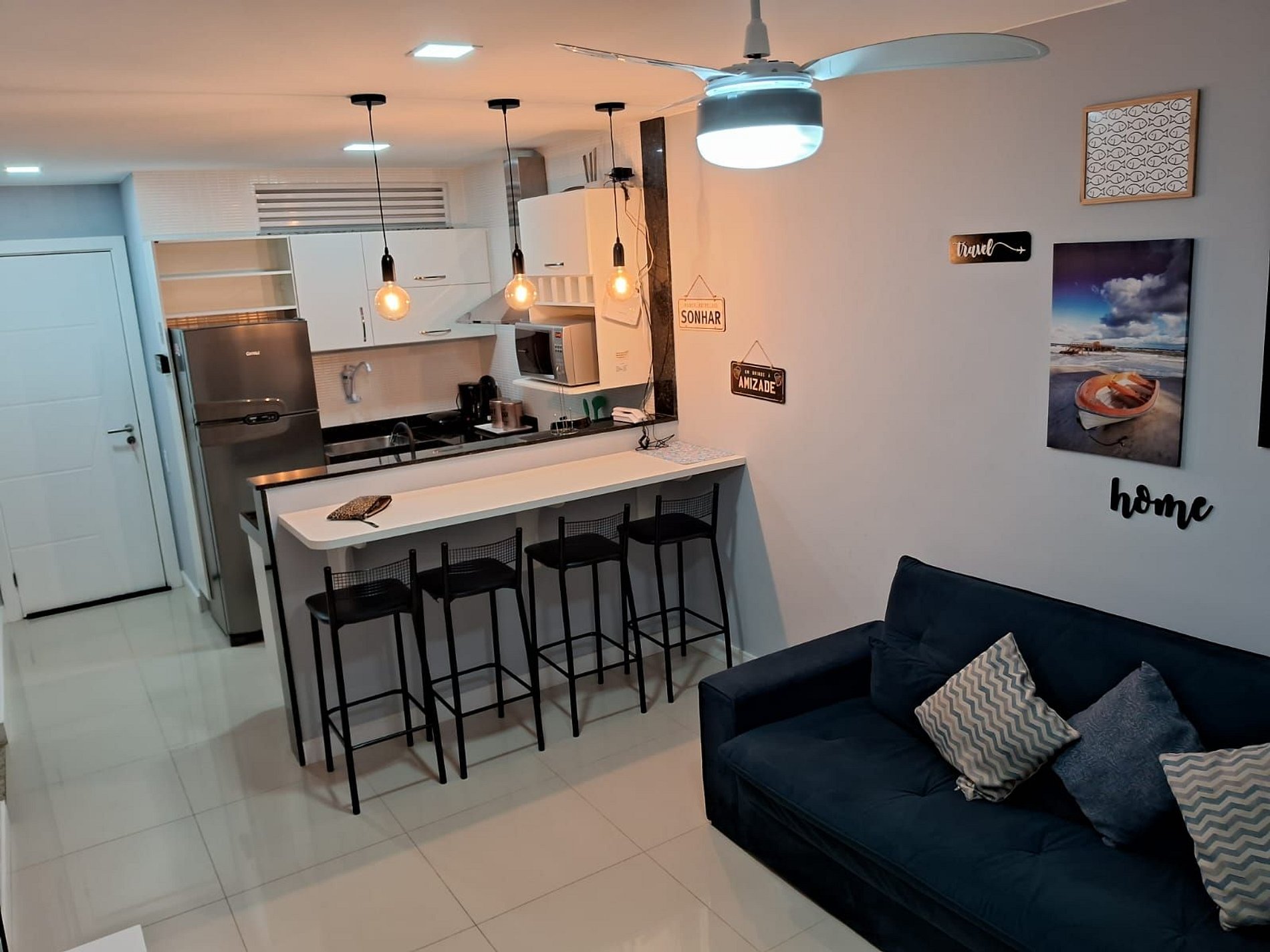 Apartamento completo mobiliado no térreo para até 6 pessoas com varanda e área externa exclusiva, 2 quartos com ar condicionado, 2 banheiros (1 suíte), sala e cozinha em conceito aberto, roupas de cama e banho inclusas.