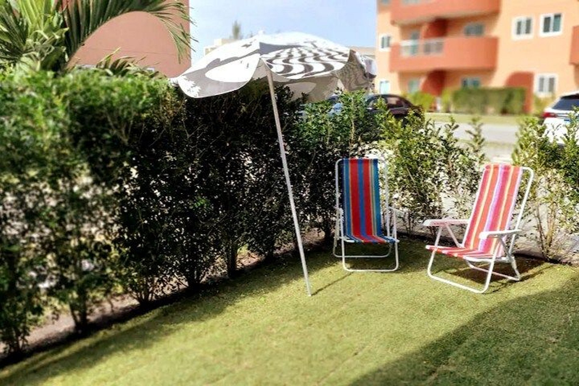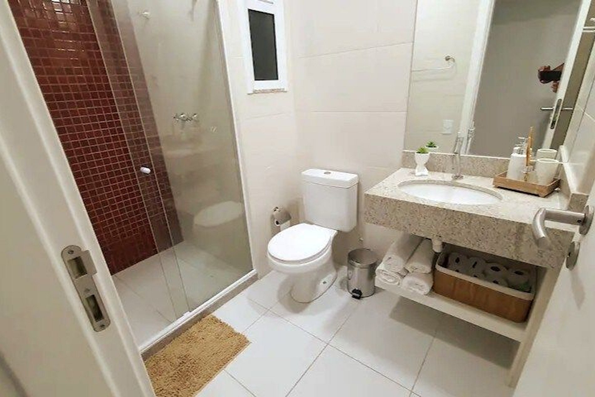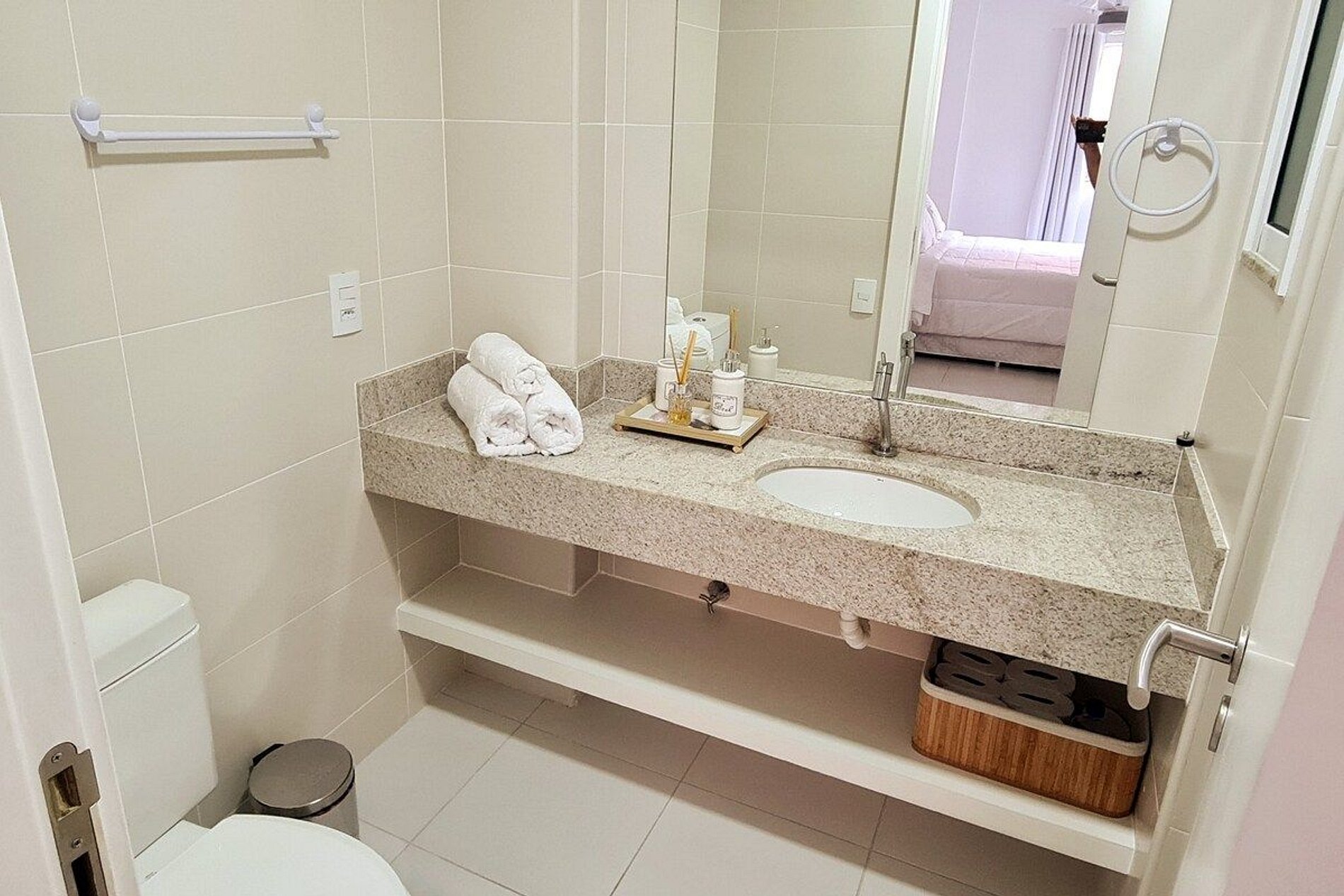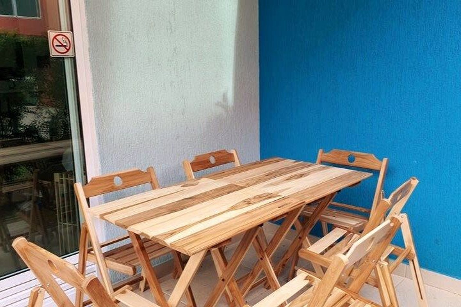 Apartamento completo mobiliado no térreo para até 6 pessoas com varanda e área externa exclusiva, 2 quartos com ar condicionado, 2 banheiros (1 suíte), sala e cozinha em conceito aberto, roupas de cama e banho inclusas.