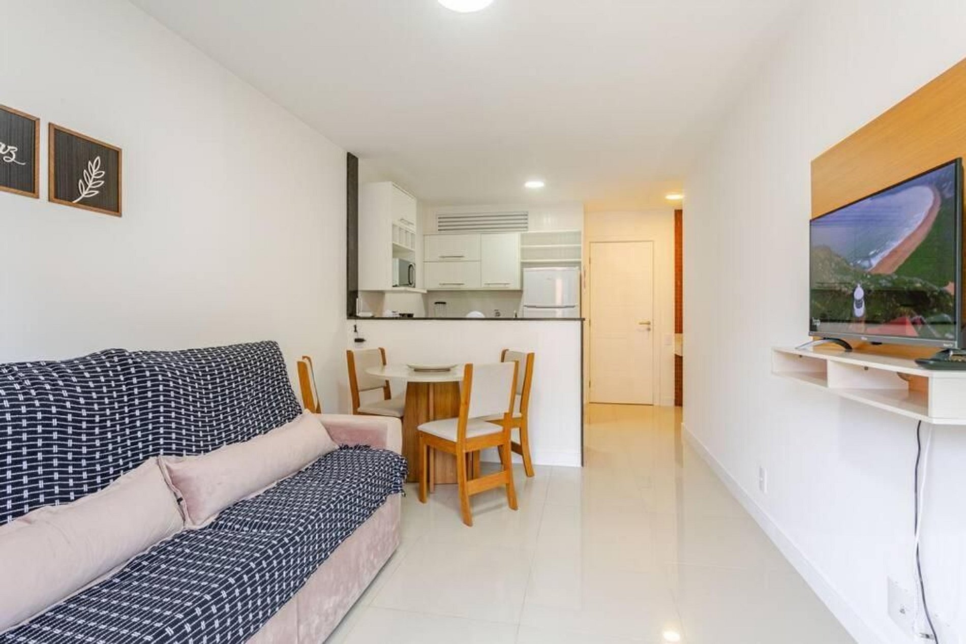 • Sala ampla, com sofá, TV Smart, e meda de quatro lugares.