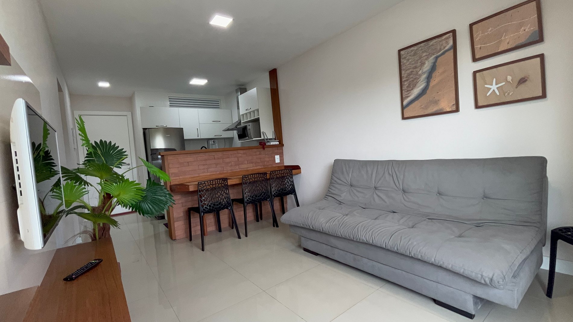 Apartamento no 2º andar para até 6 pessoas, com varanda. 2 quartos com ar-condicionado: 1 suíte com cama de casal e 1 quarto com cama de casal e auxiliar de solteiro. Sala com sofá cama e Smart TV. Cozinha equipada em conceito aberto com ilha para 3 lugares. Banheiro social. Roupas de cama e banho inclusas.