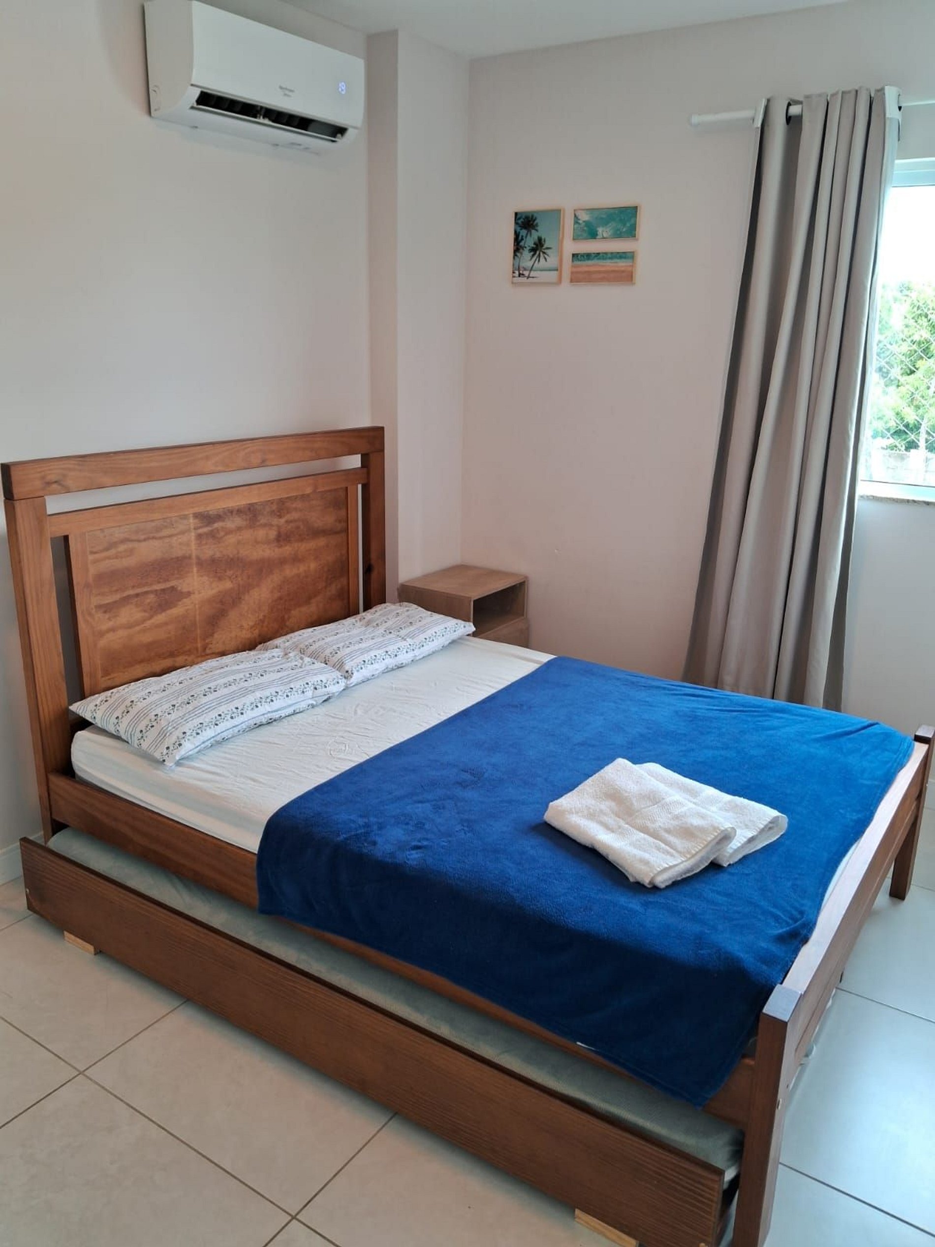 • Quarto com uma cama de casal e uma auxiliar de solteiro, perfeito para hóspedes adicionais, garantindo uma estadia agradável para todos.